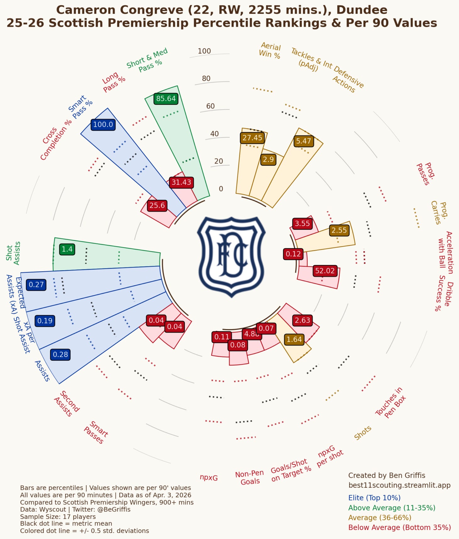 Cameron Congreve is a 21 year old Welsh U21 international Right Winger who currently is on loan at Dundee from Swansea City. His contract with Swansea City is up in Summer 2028, so he will command a fee and I think his performances this season will inflate that fee.